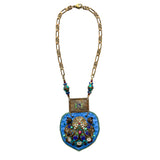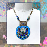 The SHIELD NECKLACE is a signature Gilded Mane design, with double layers of luxurious leather, a vintage enamel buckle & semi-precious stones.