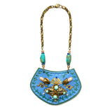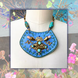 The SHIELD NECKLACE is a signature Gilded Mane design, with double layers of luxurious leather, a vintage brooch & semi-precious stones.
