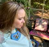 This wearable art piece is made with Genuine Reclaimed Leather, which helps Gilded Mane fulfill its mission of minimizing leather waste generated by domestic production of leather goods. Since the foundation of this piece is leather, it is durable and should last for years with proper care. Gilded Mane does not recommend exposing your accessory to rain, sweat or other liquids, as water has the potential to damage leather and suede. Gilded Mane also recommends storing jewelry flat, away from dust and sunlight.