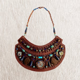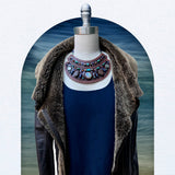 The GAIA SHIELD NECKLACE was inspired by the female form and designed to promote feelings of empowerment. The foundation of this wearable art piece is reclaimed leather - which is durable, soft and lightweight. While the careful arrangement of stones is what catches the eye, the “negative” space is just as essential. The adornment is divided into two smaller coordinating motifs, and their artful juxtaposition results in a single cohesive design.
