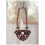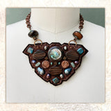 The SHIELD NECKLACE is a signature Gilded Mane design, with double layers of luxurious leather, iridescent abalone inlaid wood and pops of color throughout.
