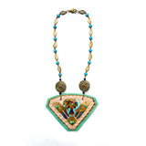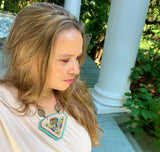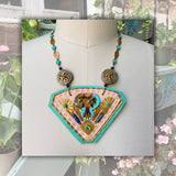 The SHIELD NECKLACE is a signature Gilded Mane design, with triple layers of luxurious leather, a vintage enamel buckle & semi-precious stones.