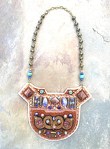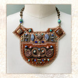 The SHIELD NECKLACE is a signature Gilded Mane design, with layers of supple leather in rich autumn hues, bronze zardozi embroidery and subtle pops of color throughout.