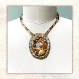 This wearable art piece is made with Genuine Reclaimed Leather, which helps Gilded Mane fulfill its mission of minimizing leather waste generated by domestic production of leather goods. Since the foundation of this piece is leather, it is durable and should last for years with proper care. Gilded Mane does not recommend exposing your accessory to rain, sweat or other liquids, as water has the potential to damage leather. Gilded Mane also recommends storing jewelry flat, away from dust and sunlight.