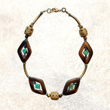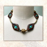 This style features Geometric Wood Beads w/ Turquoise & Sodalite juxtaposed in the center. Additional beads are African Brass Filigree & Tiger Eye.